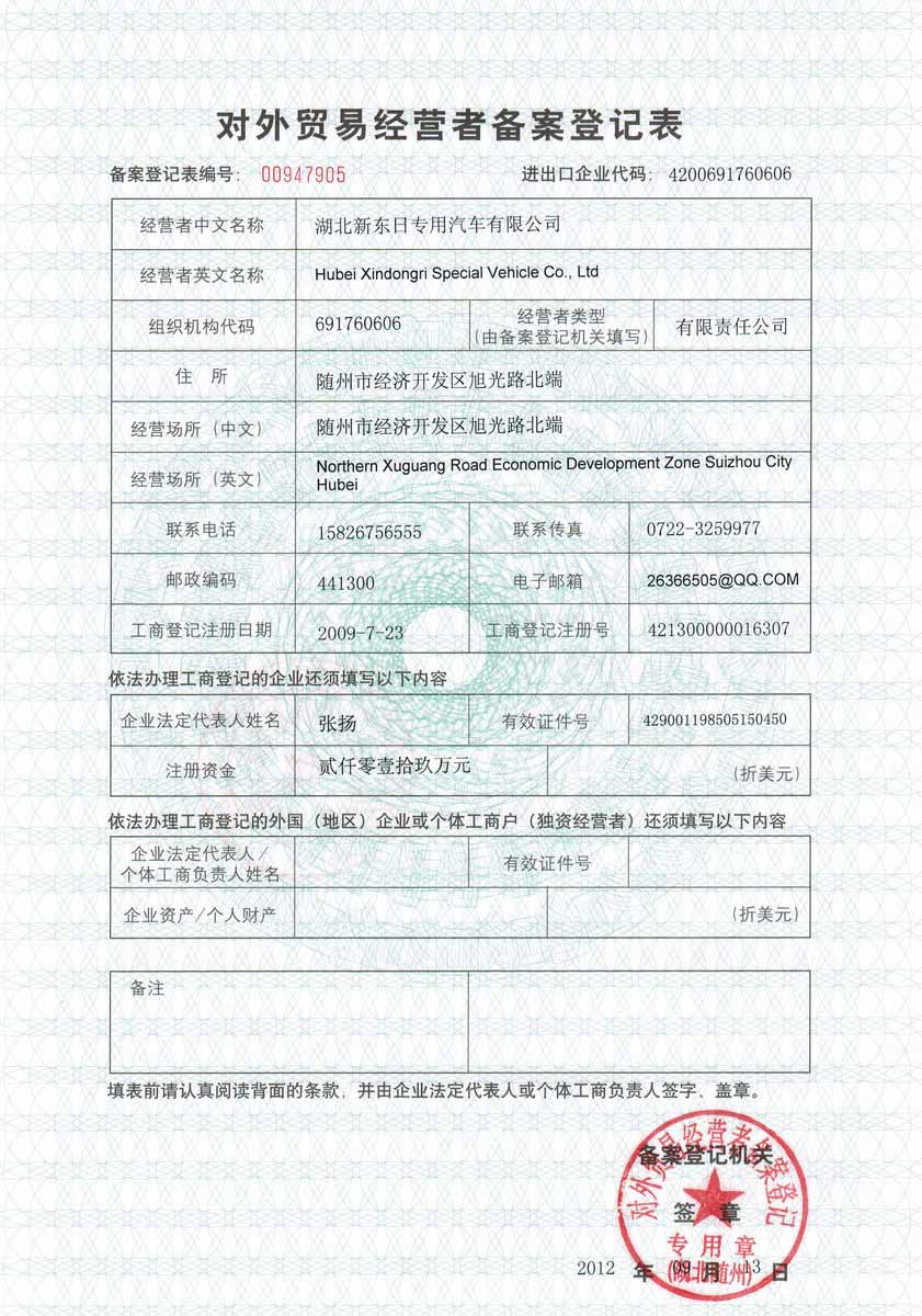 имеет право на самостоятельное осуществление экспортно-импортных операций Номер регистрационной анкеты участника внешнеторговой деятельности : 00947905 Името на компания за износ : HUBEI XINDONGRI SPECIAL VEHICLE CO., LTD Лиценз Фото :